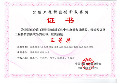 近日,中國公路建設(shè)行業(yè)協(xié)會組織開展了2014年度公路工程科技創(chuàng)新成果申報評審鑒定和評獎工作,經(jīng)過查新、申報、答辯、評審后,國誠集團有限公司以《柔性枕梁+土木格柵處治凍土區(qū)路基縱向裂縫施工技術(shù)研究》榮獲公路工程科技創(chuàng)新成果獎三等獎。