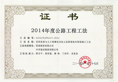 2015年1月27日,中國公路建設(shè)行業(yè)協(xié)會對2014年度公路工程工法評審結(jié)果進行了公示,國誠集團有限公司以“柔性枕梁與土工格柵處治凍土區(qū)路基縱向裂縫施工工法”獲得了“2014年度公路工程工法”證書。