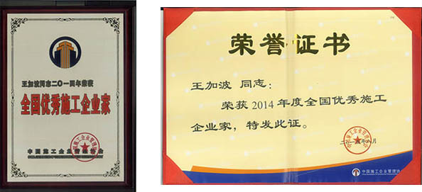 2015年9月17日,中國(guó)施工企業(yè)管理協(xié)會(huì)在北京召開(kāi)“2015年全國(guó)施工企業(yè)領(lǐng)軍人物峰會(huì)”,在會(huì)上,集團(tuán)董事長(zhǎng)王加波被授予 “全國(guó)優(yōu)秀施工企業(yè)家”榮譽(yù)稱號(hào)。