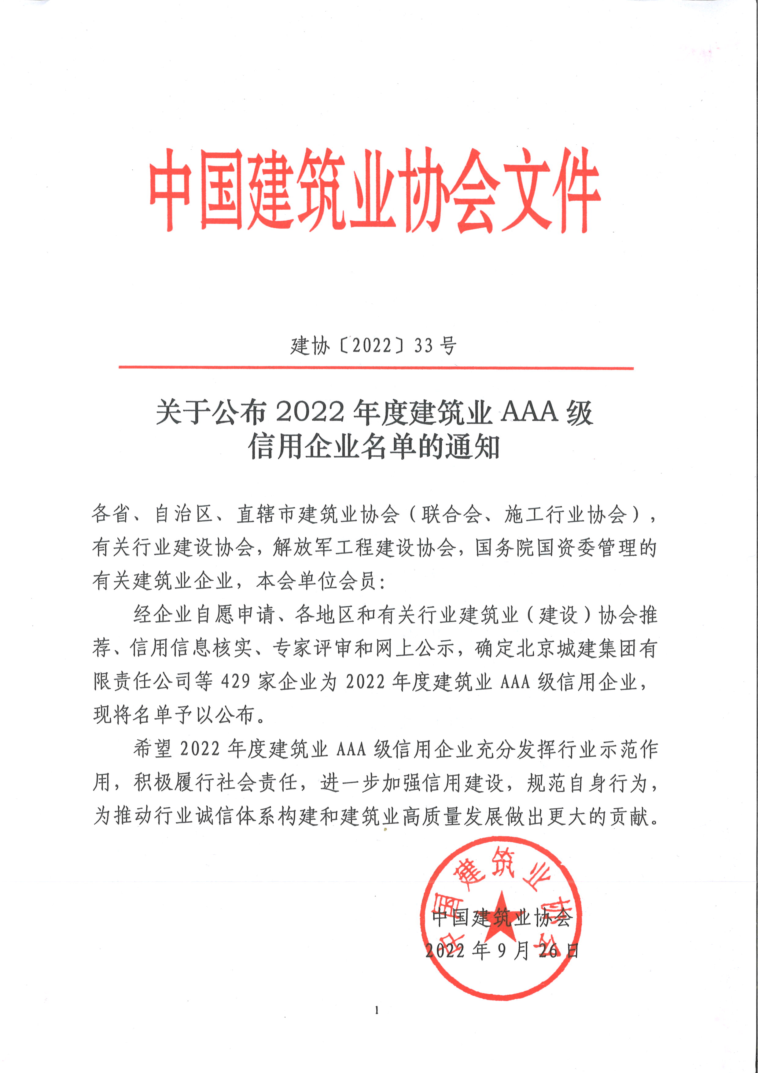 國誠集團(tuán)榮獲2022年度建筑業(yè)AAA級(jí)信用企業(yè)稱號(hào)