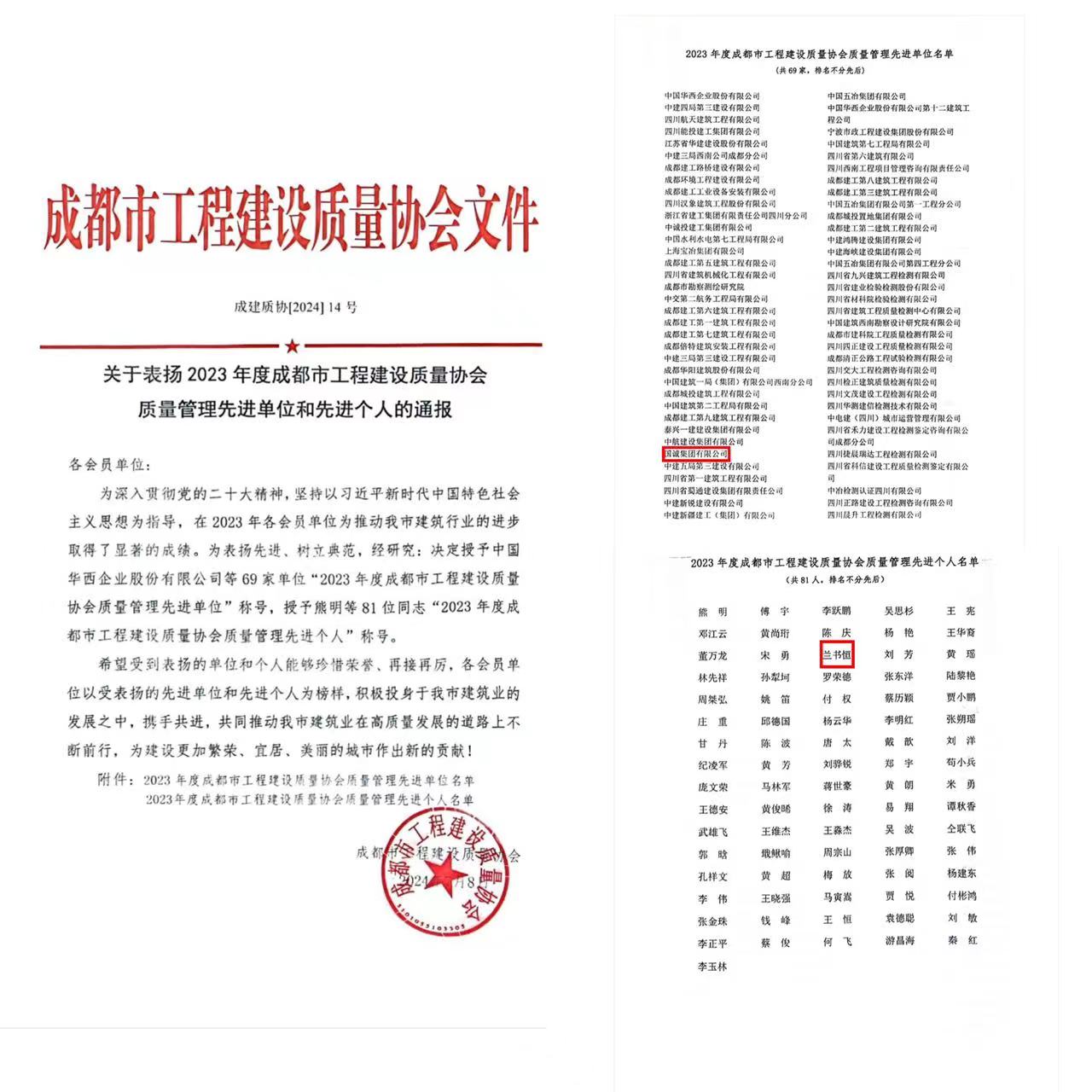 集團(tuán)副總經(jīng)理蘭書恒榮獲“2023年度成都市工程建設(shè)質(zhì)量協(xié)會(huì)先進(jìn)個(gè)人”的榮譽(yù)稱號(hào)!